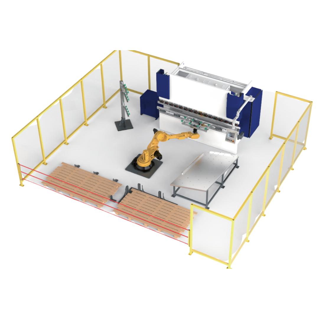 A configuração pode ser personalizada conforme as necessidades do cliente: o modelo da prensa dobradeira e do robô é selecionado de acordo com o peso, tamanho e geometria da peça, além das etapas específicas do processo de dobra. Dispositivos auxiliares adicionais podem ser projetados para atender requisitos especiais, proporcionando flexibilidade, produtividade e máxima eficiência para diferentes aplicações industriais.