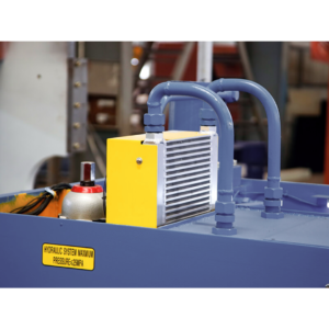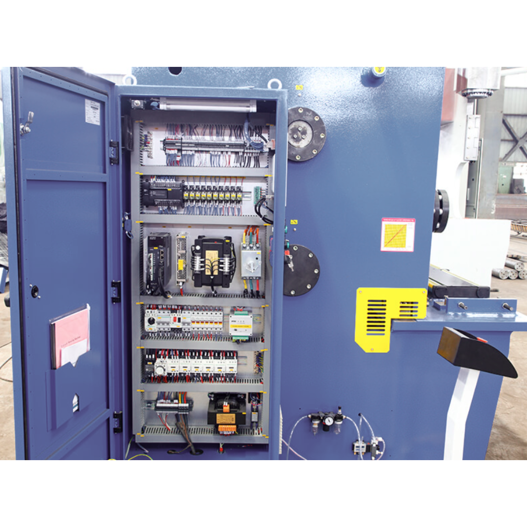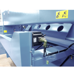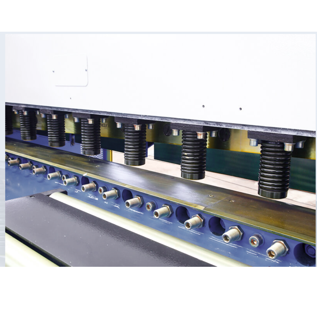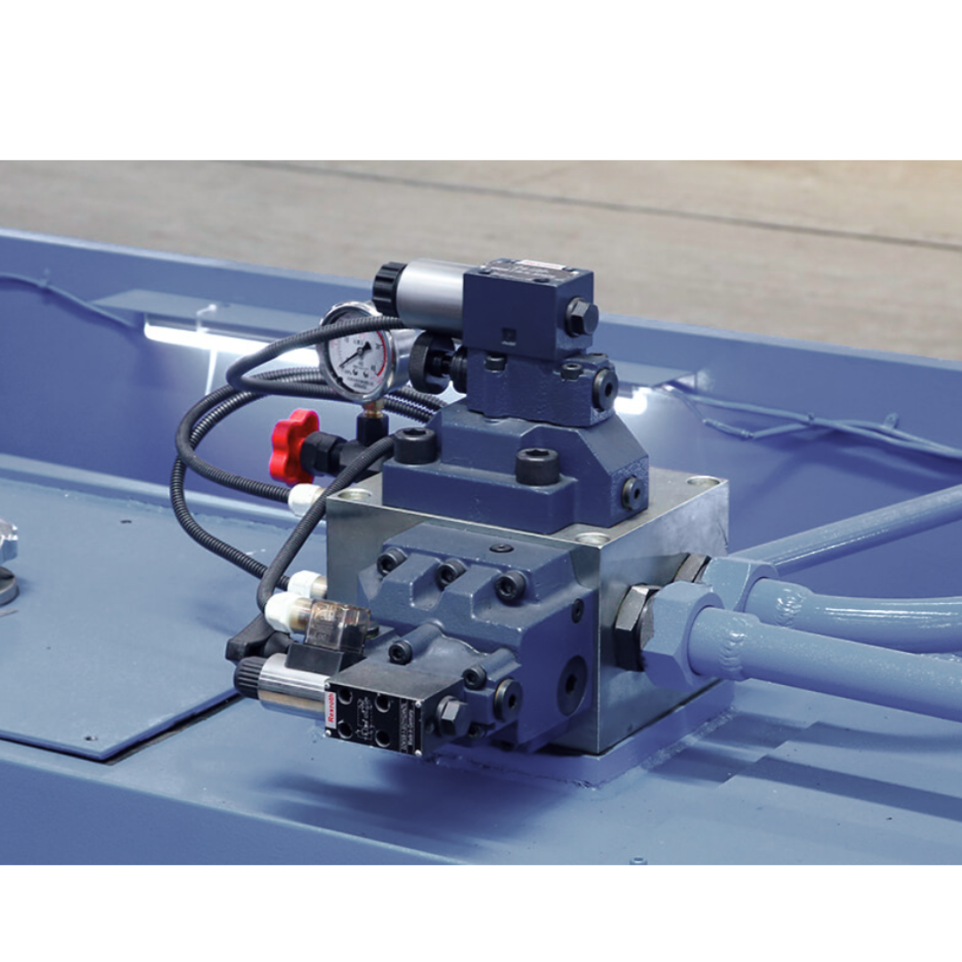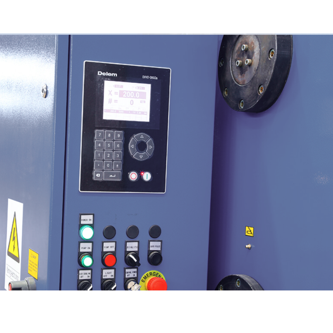 A máquina ainda conta com prensa-chapas hidráulico com força proporcional para evitar marcas em chapas finas, sistema hidráulico simples e de fácil manutenção, painel CNC (DELEM DAC-310) com memória para múltiplas sequências de corte, iluminação da linha de corte, painel elétrico IP-54, console de pedal móvel com cabo flexível e proteções completas conforme norma NR-12, incluindo barreiras de luz e botões de emergência.